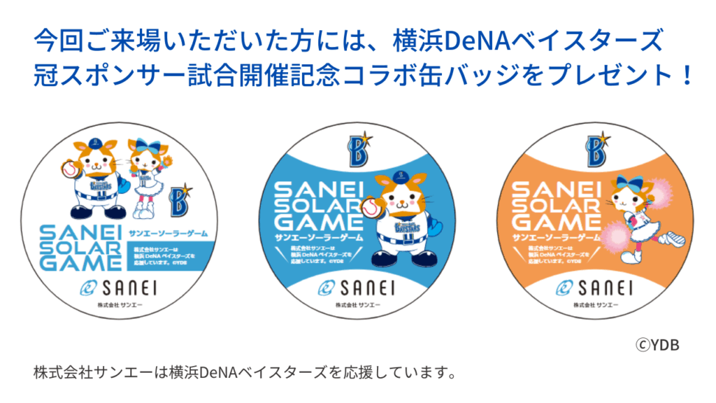 - 特典:横浜DeNAベイスターズ冠スポンサー試合 コラボ缶バッジを来場者にプレゼント